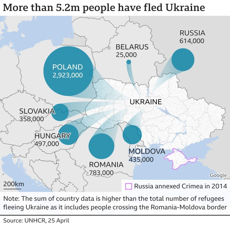Up to April 25th 2022, more than 5,2M people have fled Ukraine.